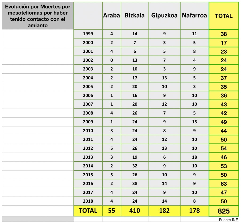 Por cada muerte por mesotelioma se producen otros 10 fallecimientos, por lo menos, según los expertos médicos, por lo que estaríamos contabilizando 8.250 muertes. Con datos reales, desde 1993 -según la Agencia Internacional para la Investigación del Cáncer (IARC) y datos oficiales del Gobierno de Gasteiz y del Gobierno de Nafarroa- en Hego Euskal Herria han fallecido hasta este momento 2.457 personas contaminadas por amianto, dado que los empresarios no pusieron las medidas adecuadas de prevención. Como hemos indicado, el amianto es tan solo uno de los cientos de productos cancerígenos con los que los trabajadores se enfrentan cada día.
