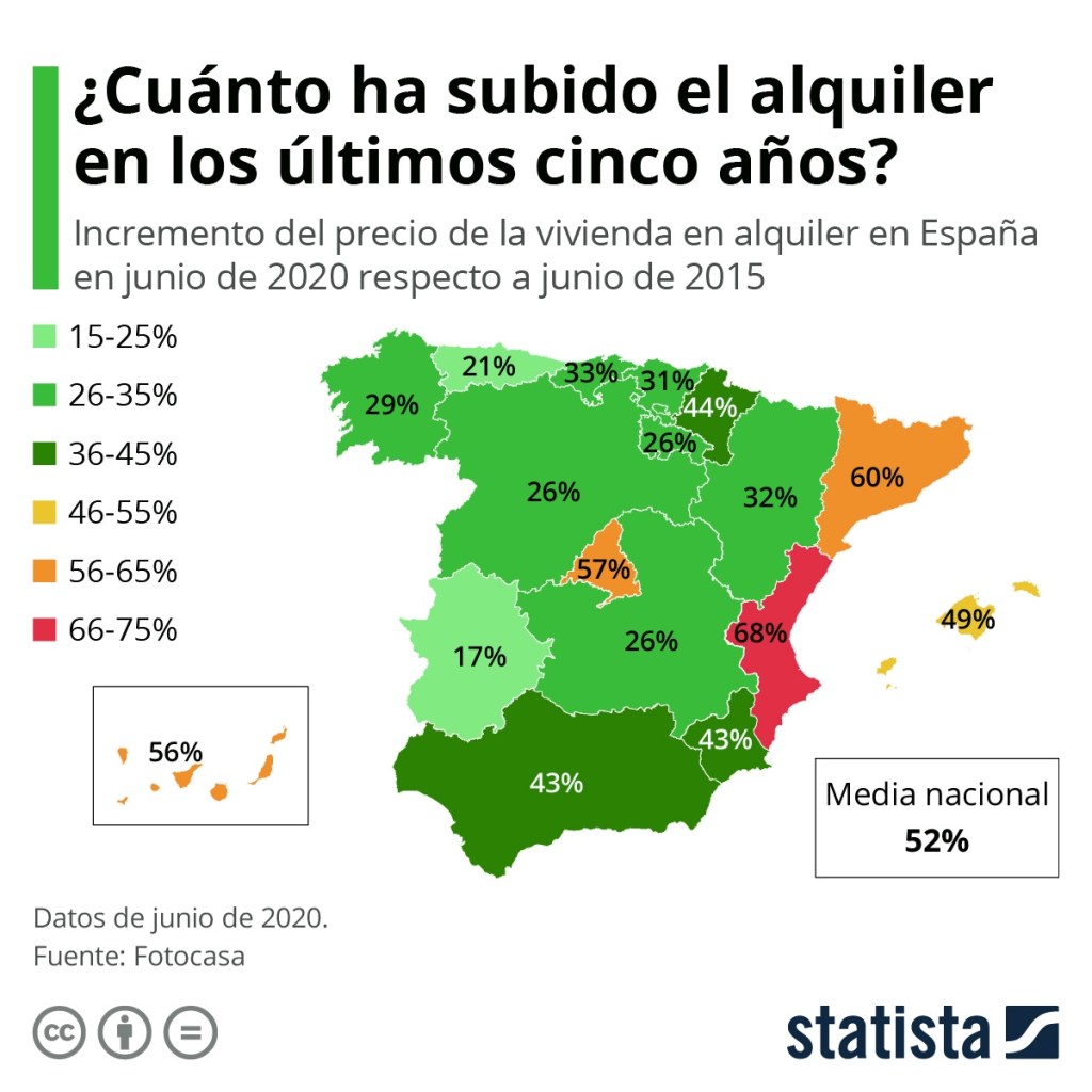 De media, en el Estado español en este lustro ha aumentado un 52%, según un estudio de Fotocasa entre 2015 y junio 2020.