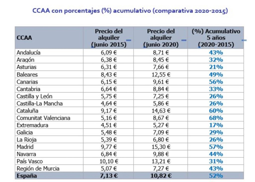 En la CAV el precio de alquiler por metro cuadrado ha pasado de 10,10 € a 13,21€. En 2015 era el precio más caro y en junio 2020 se sitúa por detrás de Madrid y Catalunya. Nafarroa se encuentra por detrás, pero el incremento en la comunidad foral en este quinquenio ha sido del 44%, según informa Fotocasa.