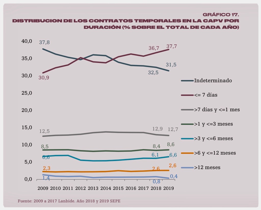 La realidad muestra que más de la mitad de los contratos que se firman no tienen una duración superior a los 30 días y, además, se conoce que los contratos de una duración inferior a siete días han pasado de representar del 30,9% en 2009 al 37,7% en 2019, lo que ahonda en esa precarización del mercado laboral que solo tiene un ganador: el empresario.