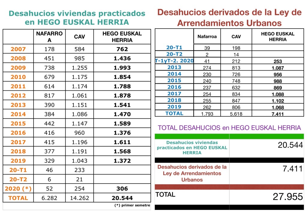 Unido a todo esto nos encontramos con los desahucios. La crisis que se prolonga desde 2008 ha motivado a una pérdida de viviendas y alquileres muy elevadas. En Hego Euskal Herria desde 2007, según los datos oficiales del Consejo General del Poder Judicial, se han desahuciado 20.544 viviendas, que han beneficiado a banca y cajas de ahorro, y otros 7.411 desahucios han sido de personas que estaban de alquiler. Por cierto algunos de éstos se han producido en el segundo trimestre de 2020, cuando estaban prohibidos por orden del Gobierno español.