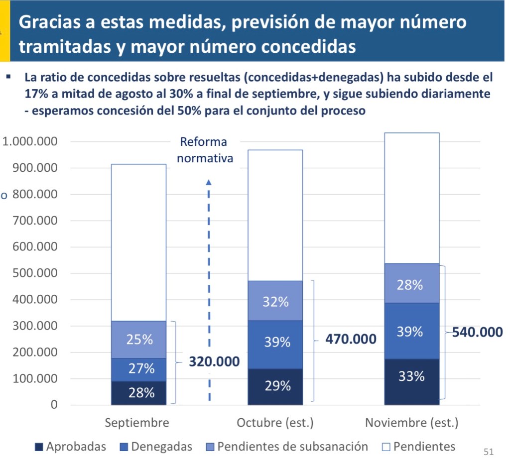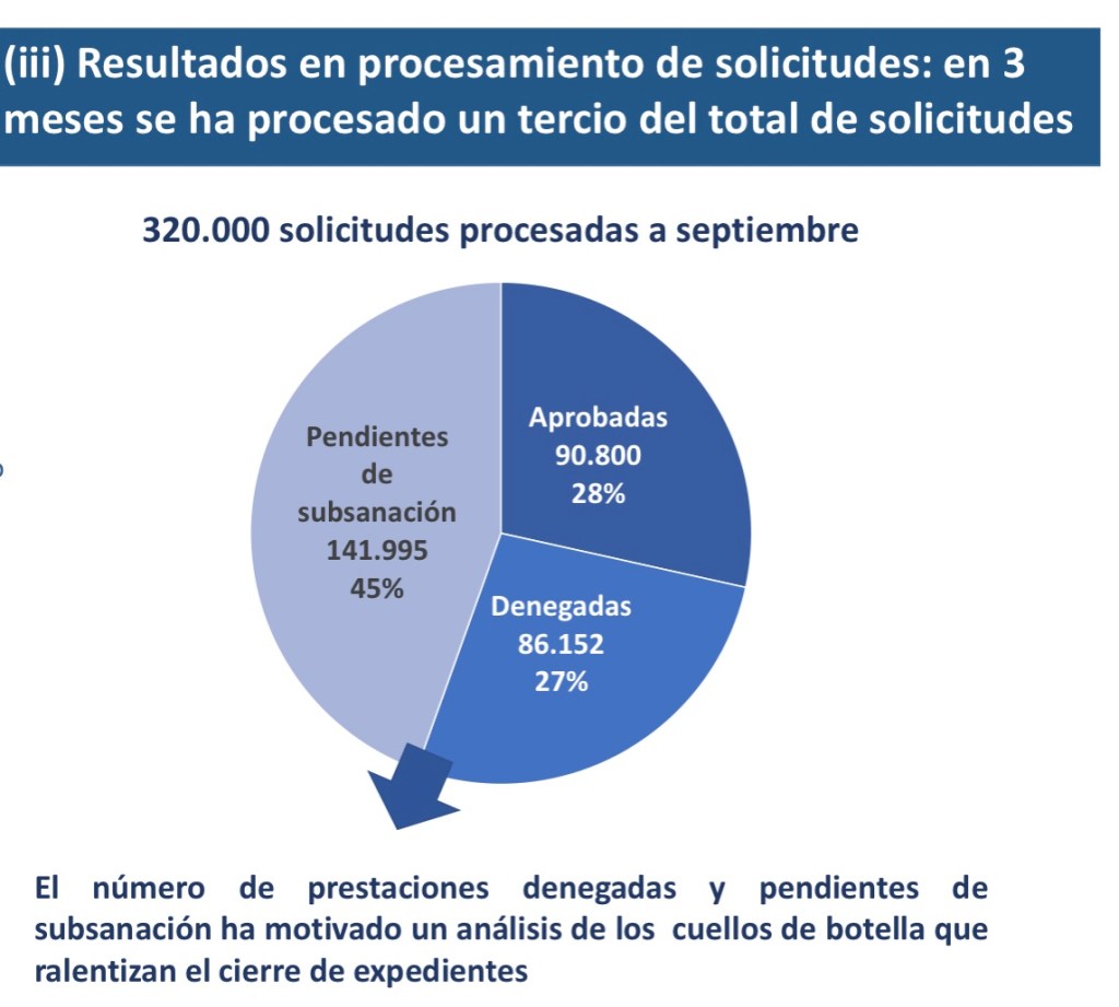 Así las cosas, del millón de peticiones que han llegado entre junio y septiembre, se han procesado hasta septiembre 320.000 solicitudes y, de ellas, se han aprobado 90.800 (un 28% del total de las revisadas). Se han denegado 86.152 (un 27%) y siguen pendiente de subsanación 141.995 (el 45%).
