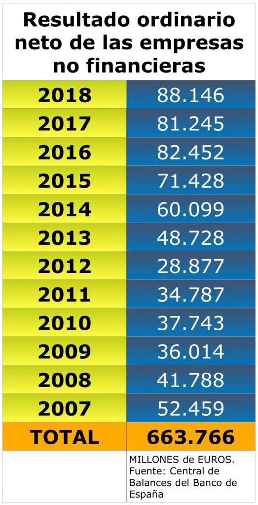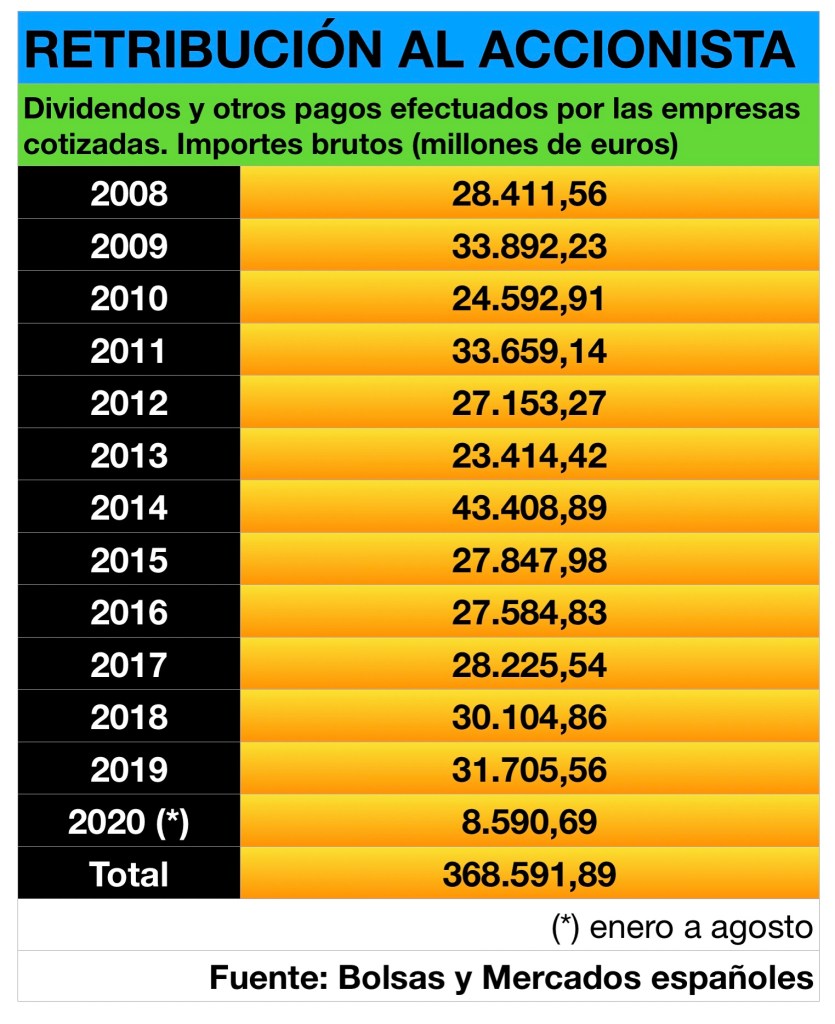 Sin embargo, nos vamos al otro lado de la balanza y comprobamos que las empresas no financieras siguen forrándose. Desde 2008 al 2018, que es el último año cerrado publicado por la Central de Balances del Banco de España, consiguieron un beneficio ordinario neto de 663.766 millones. Y, por otro lado, las empresas cotizadas en la Bolsa española repartieron desde el 2008 hasta agosto de 2020 un total de 368.592 millones en dividendos.