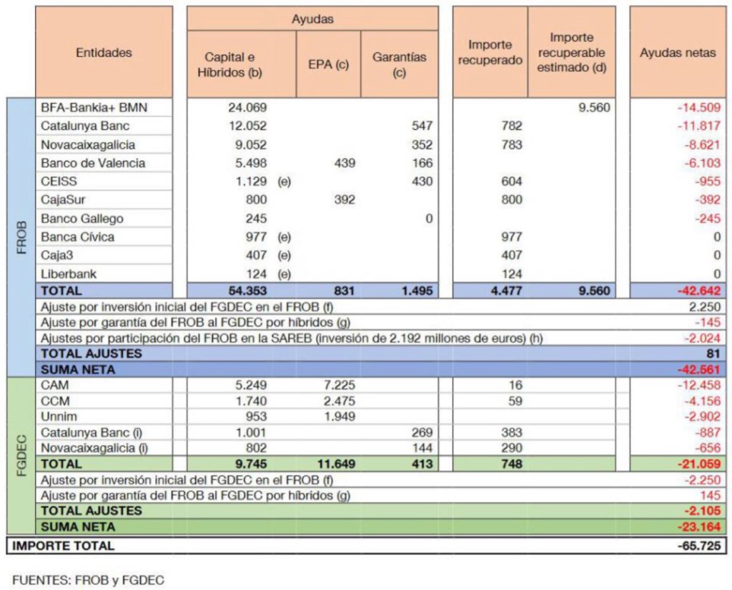 Bajo la excusa de que si caían los bancos y las cajas de ahorros se desplomaría la economía, se trasvasaron 122.754 millones directos al rescate de bancos y cajas en diferentes fórmulas, a través del Fondo de Reestructuración Ordenada Bancaria (FROB), Fondo de Garantía de Depósitos (FGD) y el Banco de España. Al final, el coste del proceso de reestructuración bancaria, según el Tribunal de Cuentas español, alcanzó los 66.577 millones, de los que entorno a 42.000 millones se dan ya por perdidos para las arcas públicas, después de algunas devoluciones. En el conjunto de la UE el apoyo neto a los poderosos económicos se elevó a los 369.755 millones.
