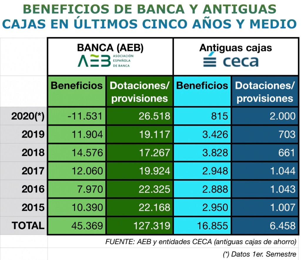 Otro tanto ocurre con las antiguas cajas, dependientes de CECA. En 5 años han logrado un beneficio neto de 16.855 millones y han desviado a dotaciones y provisiones un total de 6.458 millones. Este año, hasta junio ganaron 825 millones, cifra modesta respecto a otros años, pero han apartado 2.000 millones para los inconvenientes que puedan llegar por la crisis.