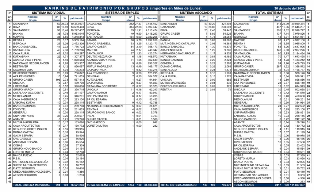 La realidad es tozuda. De hecho, en 1995 los fondos de pensiones controlaban 12.822 millones, sin embargo se han multiplicado casi por nueve veces y en junio de 2020 superan ya los 111.828 millones en 49 fondos. Ese patrimonio está en manos de bancos y aseguradoras. Caixabank (29.059 millones), BBVA (21.646 millones) Santander (12.998 millones), Bankia (7.980 millones) e Ibercaja (6.604 millones) son los principales. Kutxabank posee un patrimonio de 1.409 millones y Laboral Kutxa, 258 millones, por citar a los más cercanos.