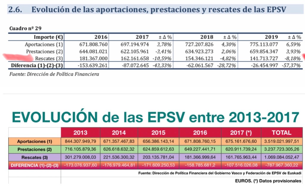 Sin embargo, si se analizan conjuntamente las aportaciones, prestaciones y rescates, debe señalarse que la diferencia entre lo recaudado por aportaciones y la suma de las prestaciones abonadas y los rescates realizados en los Planes de Previsión presenta un saldo negativo en el periodo 2013-2019 de 850,5 millones. De déficit. De ahí que Ina Etxebarria, presidente de la Federación de EPSV de Euskadi, pidiera que se obligue a invertir en una EPSV de Empleo por negociación colectiva, puesto que hasta la jubilación no se detraerían recursos.