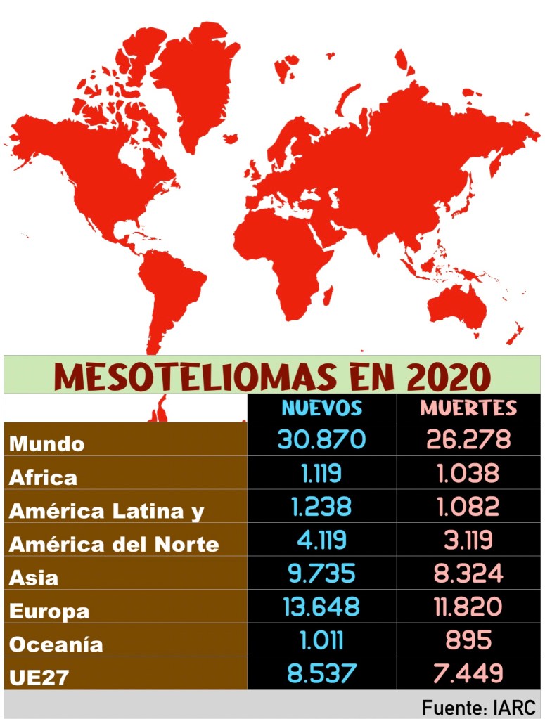 Con los datos oficiales del INE de ese período de 20 años las muertes por mesotelioma han aumentado un 91,95%. Lo peor es que todavía no ha revertido la curva ascendente de mortalidad. De hecho, en la Unión Europea en 2019 ya se han sobrepasado las 90.000 muertes por enfermedades producidas por el amianto, mientras que la IARC confirma que es en territorio europeo donde la letalidad es superior a la del resto del mundo con 7.449 muertes por mesoteliomas en 2020, pero con 8.537 casos nuevos. En todo el mundo, el año pasado se produjeron 26.278 muertes por mesotelioma, lo que significaría entre 262.780 y 394.170 personas fallecidas por el asesino silencioso. Deja muy atrás a las previsiones de la Organización Mundial de la Salud (OMS), que las situaba en unas 100.000 anuales y a las previsiones que un equipo en el que se encontraba Jukka Takala, ex director de la Agencia para la Seguridad y la Salud en el Trabajo, con sede en Bilbao, elevaba a 265.000 muertes.