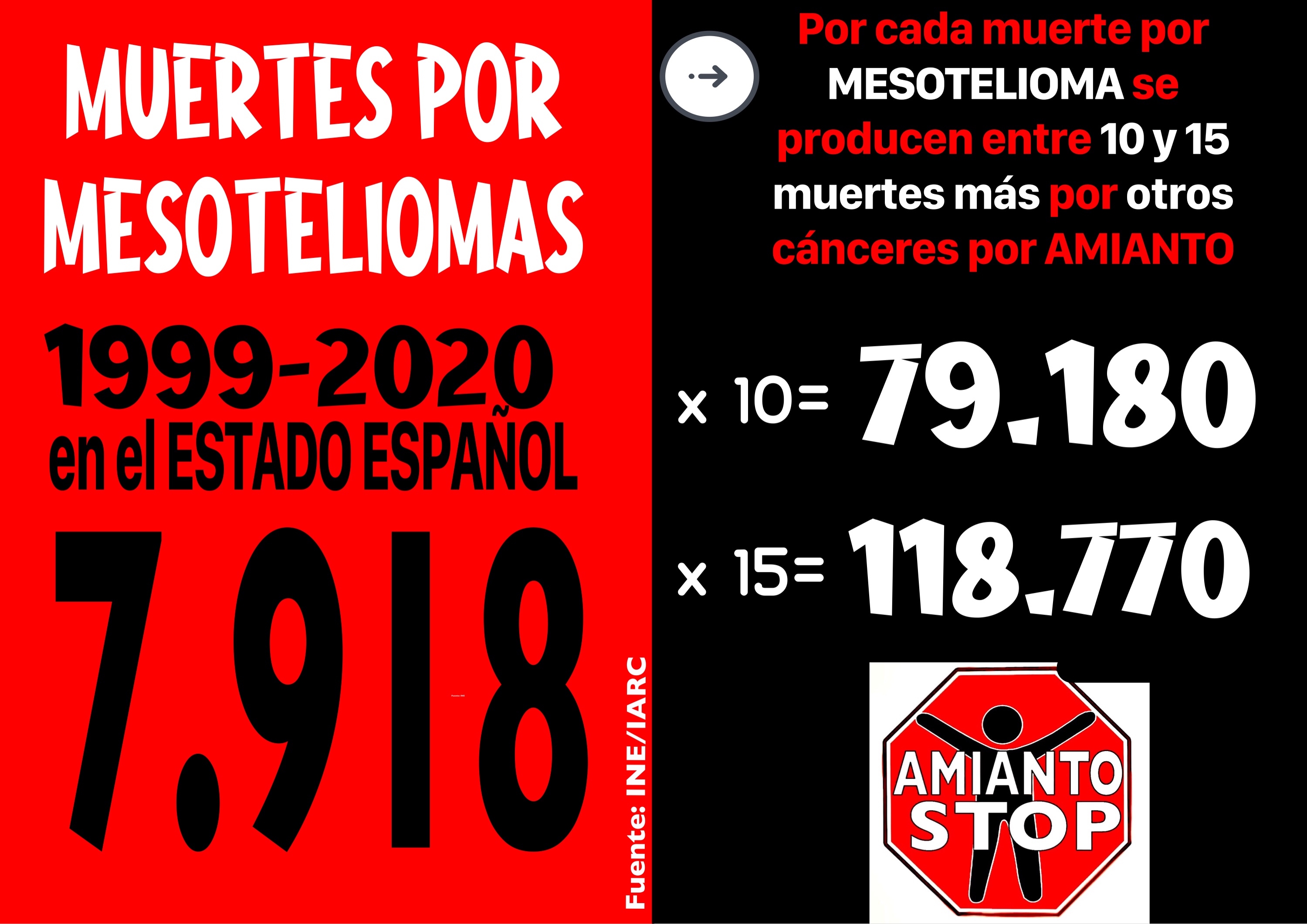 Entre 1999 y 2019 en el Estado español fallecieron 7.414 personas por mesotelioma, un cáncer muy letal y fulminante provocado por la inhalación de alguna microfibra de amianto, según los datos aportados por el INE. Y se elevan a 7.918 con los datos de 2020, según los compilados por la Agencia de Investigación del Cáncer (IARC, en sus siglas en inglés), dependiente de la OMS. Los expertos médicos determinan que por cada muerte por mesotelioma hay entre 10 y 15 más por patologías derivadas del mineral cancerígeno. Es decir, en ese período entre 79.180 y 118.770 personas, la gran mayoría trabajadores, habrían fallecido por la falta de medidas de prevención y seguridad en las empresas.