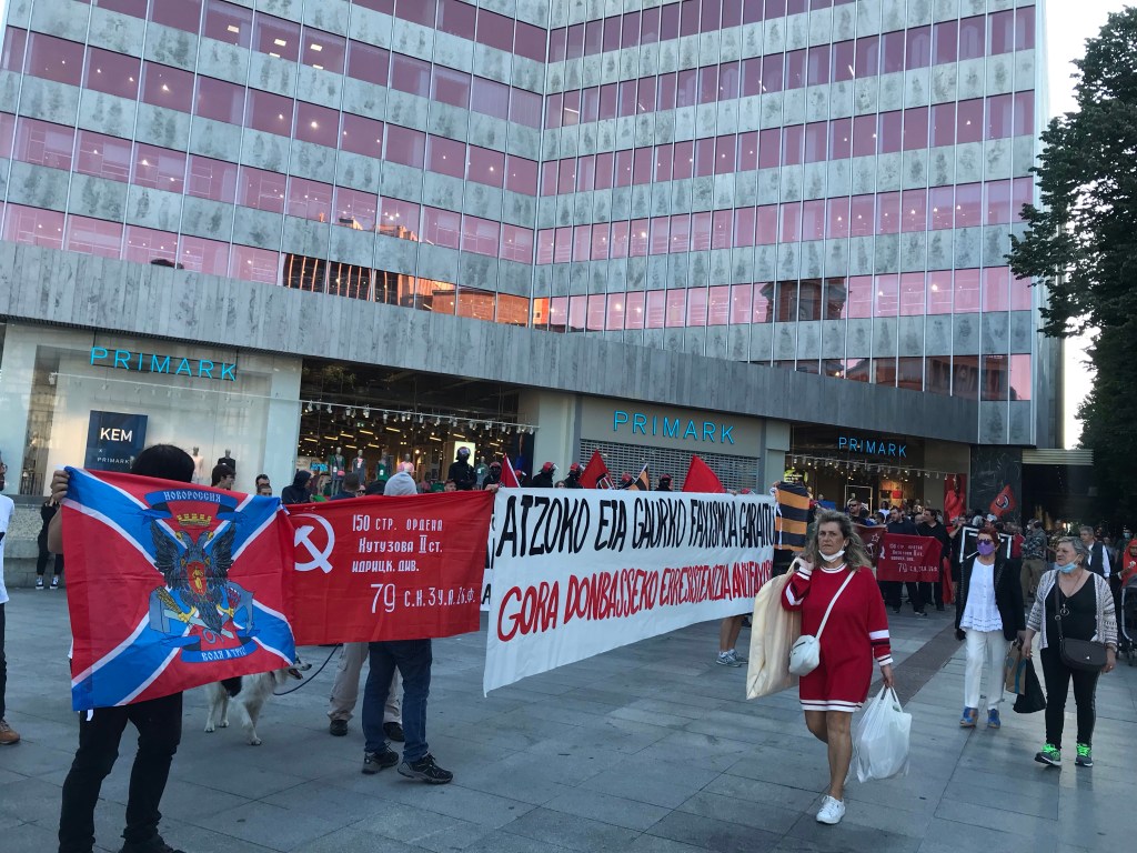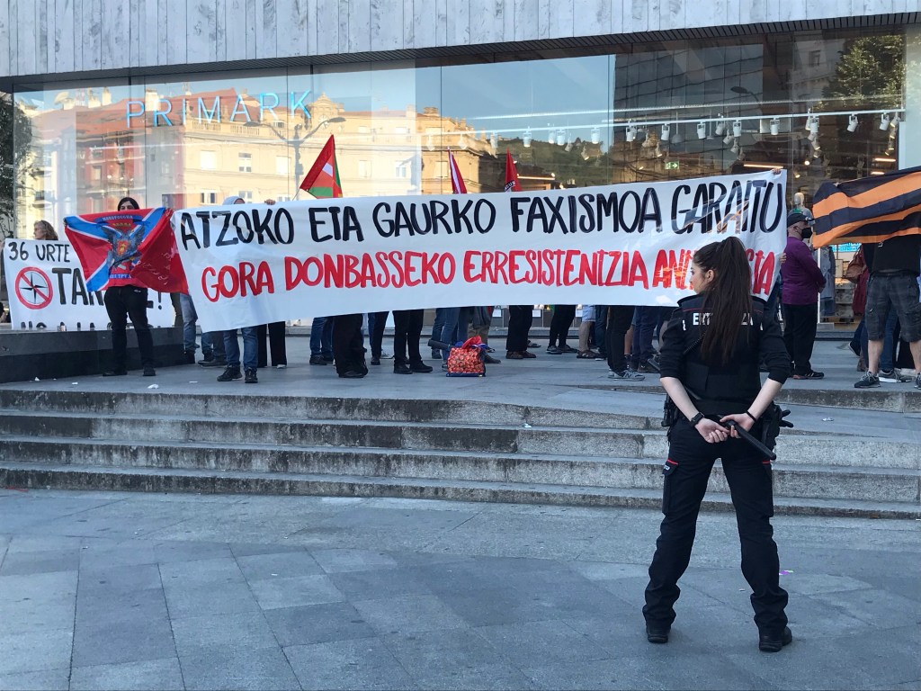 Nada más comenzar la concentración, una pareja ha despegado una bandera de Ucrania a la entrada del centro comercial Primark, lo que ha elevado la tensión, momento en que la Ertzaintza, que vigilaba el acto de cerca, ha desplegado varias dotaciones de la Brigada Móvil para controlar la concentración pacífica. En ese momento, han arreciado los gritos hacia quienes mostraban solidaridad con el régimen de V. Zelenski como “Zuek faxistak, zarete terroristak” y otros como “Euskal Herria Antifaxista”. También se han coreado gritos contra la OTAN y la UE: “OTAN/UE hiltzaileak” durante varios momentos en una zona muy concurrida de gente.