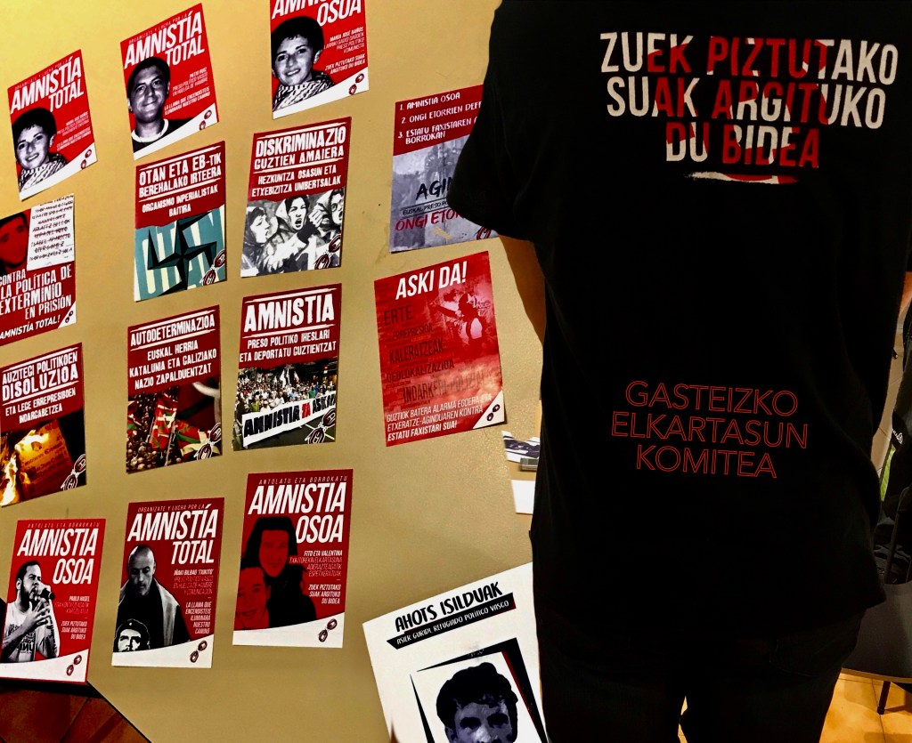 Luego también ya yendo un poco más a lo general es importante señalar a los refugiados políticos, que son los grandes olvidados. No sabemos muchos donde están y los que sabemos, están a cientos de kilómetros. El caso de Asier Guridi es el caso conocido por la propia campaña que ha podido realizar él y es algo que los colectivos hemos podido socializar, bien sea haciendo campañas en su favor, bien sea con concentraciones o las charlas, que en Gasteiz se dio una. Pero hay otros casos de refugiados que pueden estar igual o peor que él, incluso, pero por esa situación que, además, no se conocen entre ellos, son los grandes olvidados y no hay ningún apoyo hacia ellos. Nos gustaría remarcar eso, que nosotros luchamos no solo por la amnistia de los presos políticos, sino por la vuelta a casa de todos los refugiados y refugiadas y, al igual que los presos políticos, con la cabeza bien alta y sin renunciar un ápice a su lucha.