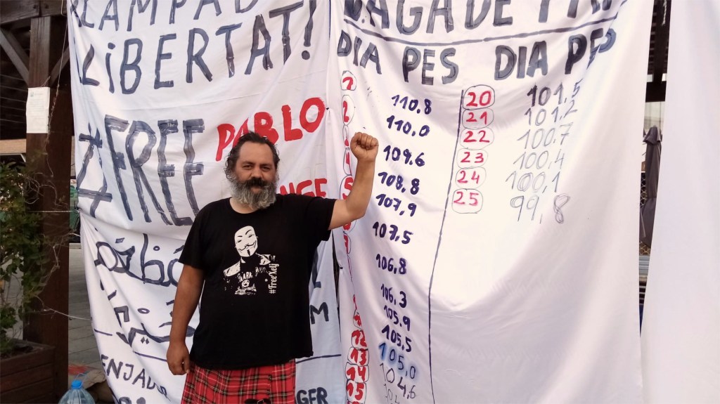 “Tengo náuseas, lo típico de las huelgas de hambre: dolor de huesos, el estómago me duele, porque tengo una hernia, dolor de cabeza…lo normal. Diarreas. Voy teniendo lo que se suele tener por estos días”, nos dice. Su objetivo es estar en huelga de hambre hasta la fecha de revisión de la prisión del periodista Pablo González, cuando cumpla 72 días en ayuno. A la vez, la Acampada Llibertat es parte de la lucha social con la que está comprometido con “el apoyo de muchas personas”.
