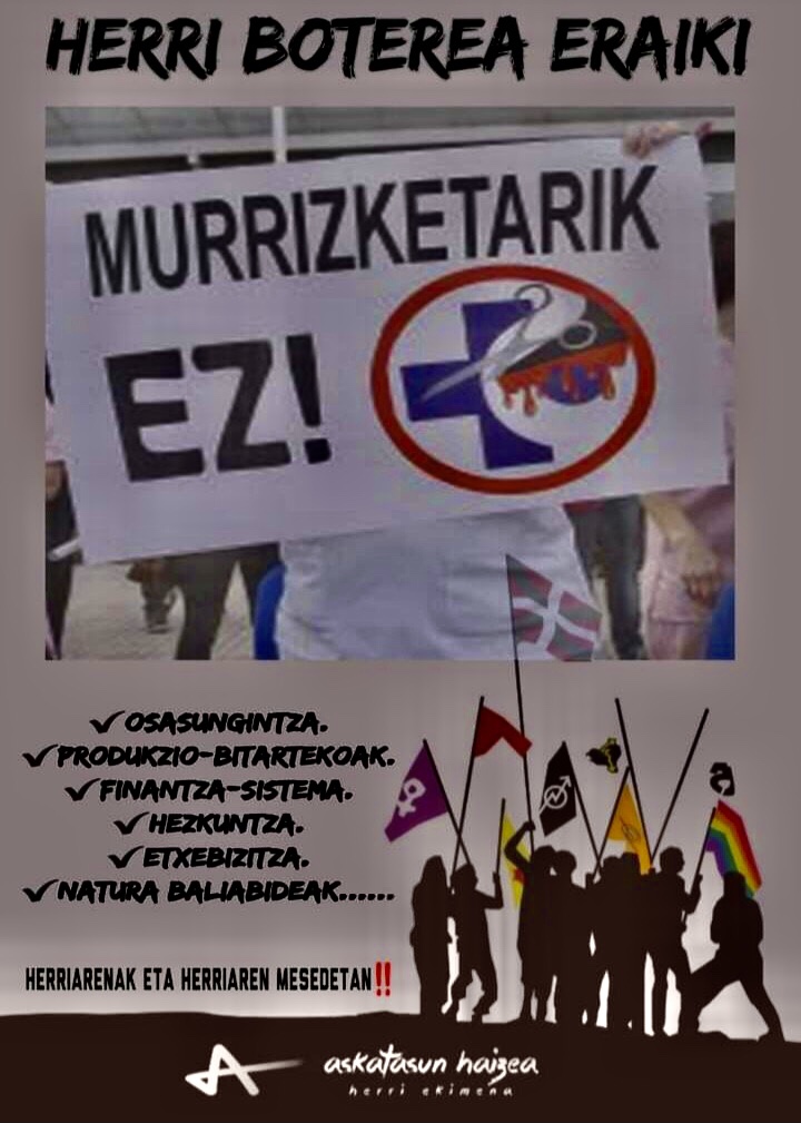 Son pequeños grupos que se unen para llevar a cabo plataformas o iniciativas diversas, y que están dando una nueva vida al movimiento popular desde unos parámetros políticos diferentes. La aparición de estos grupos, como el nuestro, que se mueven en torno a dinámicas locales o comarcales, puede ser un primer paso hacia la configuración de un nuevo movimiento social y popular vasco. Son referentes muy pequeños que trabajan generalmente en áreas concretas de intervención, pero que son capaces de unirse y colaborar ante objetivos compartidos. Grupos que, además, comparten una lectura social, anticapitalista y antifascista, y en numerosos casos también situando Euskal Herria como marco de lucha, con objetivos independentistas. Estos nuevos colectivos no significan una continuidad o una ruptura con lo anterior, sino una definición diferente; una nueva forma de crear espacios de lucha desde los pequeños grupos de resistencia. Parafraseando a Galeano, un mar de fueguitos resistentes que pueden llegar a confluir en un océano liberador. Al menos, eso esperamos.