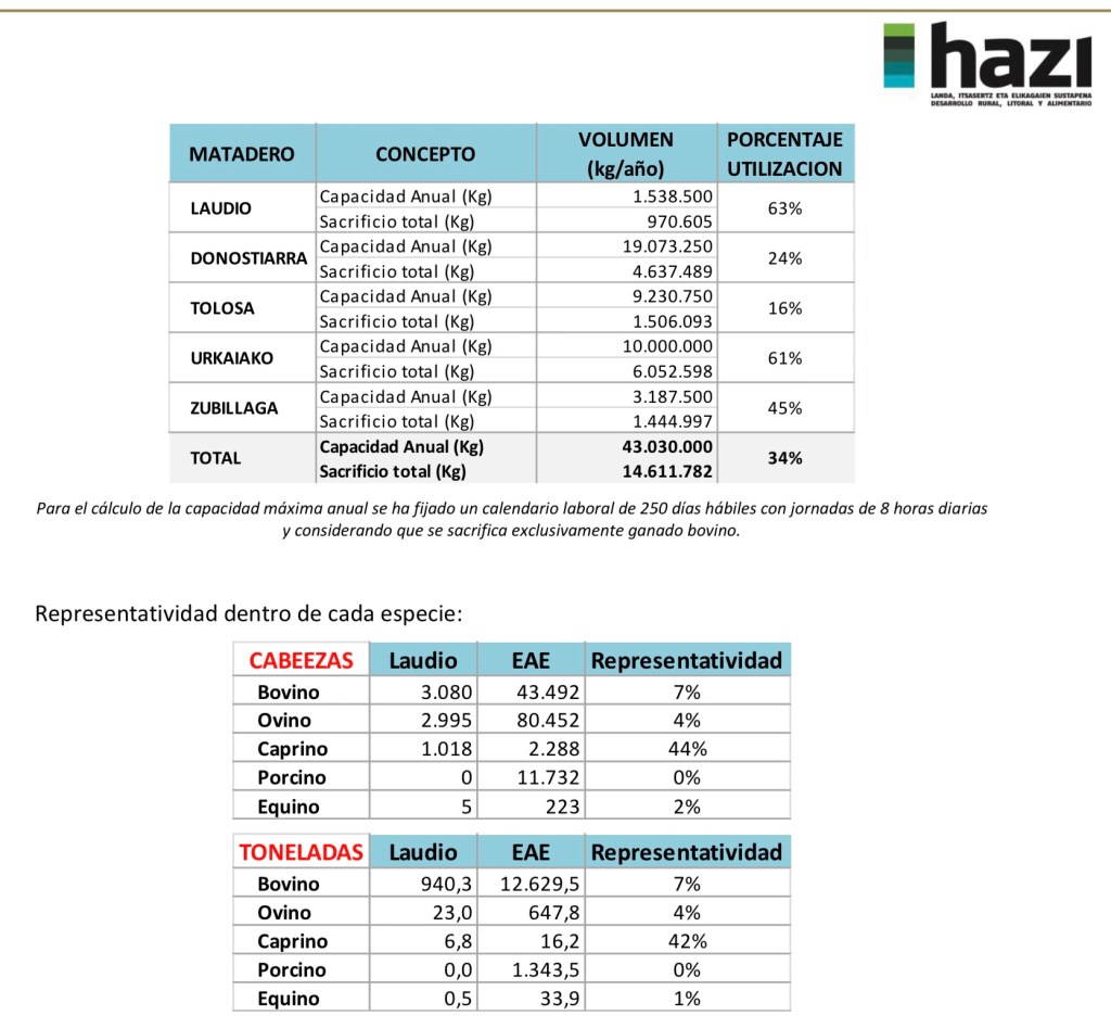 La fundación Hazi, ligada al Ejecutivo de Gasteiz, realizó ese estudio al que se refiere Arantza Tapia (PNV) y en el mismo se da cuenta de la actividad. “Previo al cierre del matadero de Laudio (02/07/2021), la CAV cuenta con la actividad de 9 mataderos, de los cuales 6 se dedican al sacrificio de ganado mayor (Laudio en Araba, Karrantza en Bizkaia y Tolosa, Zestoa, Donostia y Oñati en Gipuzkoa) y 3 al de ganado menor(aves en Berantevilla en Araba y en Zerain en Gipuzkoa y conejos en Mungia en Bizkaia). En el año 2000 el número de mataderos ascendía a 22, de los cuales 11 eran de ganado mayor” y añade que “con el cierre del matadero de Laudio, Araba únicamente cuenta con el matadero privado ARPISA, una empresa ubicada en el sector avícola. Por lo tanto, en Euskadi exceptuando el pequeño matadero municipal de Karrantza, los únicos mataderos de ganado mayor se sitúan en Gipuzkoa (Oñati, Tolosa, Donostia y Zestoa)”.