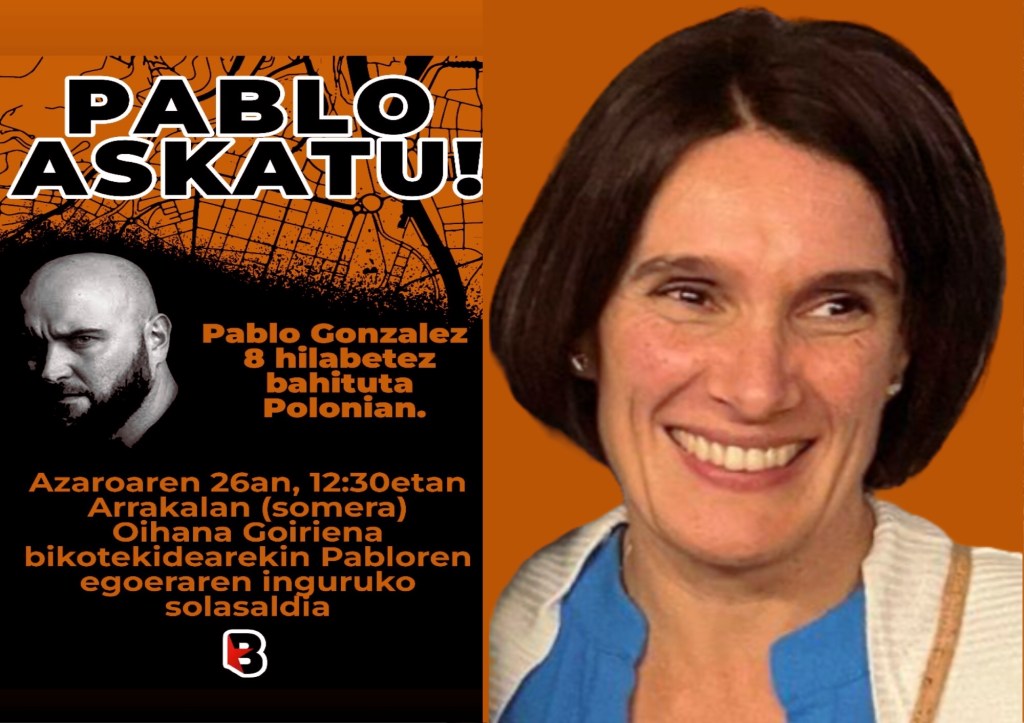 Goiriena participará este sábado 26 de noviembre en una charla que Bultza Herri Ekimena ha organizado en el centro Arrakala, a las 12:30 horas, en la calle Somera de Bilbao. La esposa de Pablo González ha asegurado que el encuentro con su marido es fruto de la solicitud que envió el 6 de junio y añadió que “le he visto bien, más flaco, dentro de las circunstancias”.