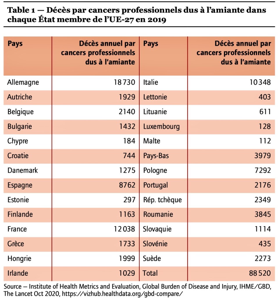 Mientras se revisa la directiva europea sobre el amianto en el trabajo, “HesaMag”, de la ETUI -European Trade Union Institute-Instituto Sindical Europeo es el centro independiente de investigación y formación de la Confederación Europea de Sindicatos (CES)- dedica un trabajo especial sobre la fibra cancerígena mortal y la urgencia de actuar para detener su “carnicería”. En la publicación: “Amianto: una bomba de relojería que hay que desactivar” se detalla que en la UE se producen al año 88.520 muertes por amianto, por lo menos, y sitúa al Estado español con 8.762 muertes en 2019, haciendo referencia a los datos del Institute of Health Metrics and Evaluation, Global Burden of Disease and Injury, IHME/GBD. Esta mortalidad es una cifra superior a la que maneja el ministro español José Luis Escrivá.