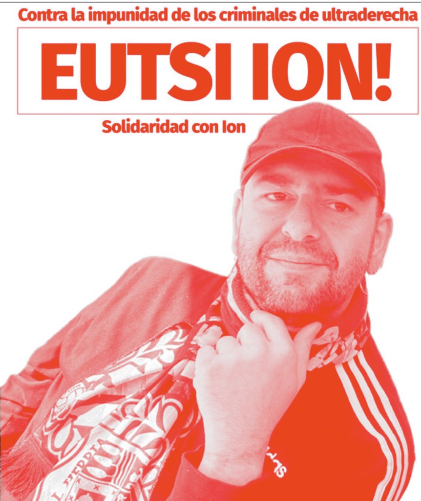 Hace, ya, un mes desde el maldito día en el que Ion se reencontró con sus amigos en Soria; desde que viajó en coche con su amigo y no regresó; desde que sucedió lo que nunca debió haber sucedido. Mientras Ion estaba disfrutando de un día de fútbol en buen hambiente, de repente, varios grupos de ultraderecha entraron por los dos lados de la calle armados con piedras, botellas y palos. Sólamente recibió ayuda de la gente que se encontraba en las inmediaciones y los profesionales de ambulancia que lo trasladaron al hospital. Los otros, sin embargo, salieron de aquella calle en autobús y escoltados por la policía. ¿Por qué no se quedó la policía a socorrer a Ion? ¿Por qué les dejaron huir a los atacantes como si no hubiera pasado nada? ¿ Por qué no había un dispositivo de seguridad debidamente organizado y serio sabiendo que los atacantes se habían juntado para hacer una capea y habiendo un partido de fútbol importante? ¿Cómo es que no se previó el ataque armado y cobarde? ¿Cómo es posible? Estas son algunas de las preguntas que nos hemos hecho durante este mes. Y tenemos la respuesta; estamos convecidas/convencidos. Una vez más, la ultraderecha ha actuado con total impunidad; entraron en la calle armados y salieron de rositas escoltados. Hoy por hoy, ninguno de ellos ha pagado por aquello.