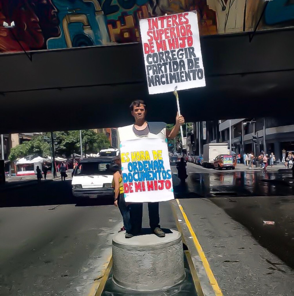 La lucha por la rectificación de los documentos de Registro Civil de mi hijo Iban comenzó en junio de 2022, cuando presente en el Circuito Judicial de Protección de Niños Niñas y Adolescentes del Estado Aragua una solicitud de rectificación y esta fue declarada improcedente en septiembre de 2022 por motivo de forma, remitiéndome a la vis administrativa o registro civil. Acudí a la vía administrativa y no obtuve ninguna respuesta hasta marzo de 2023 donde en el Registro Civil del Estado Aragua me dijeron que habían perdido mi expediente. Así me vi obligado a lograr una entrevista con Alexis Corredor quien era el Rector del CNE (poder electoral) encargado de Registro Civil y mantuvimos una amena conversación. Seguido obtuve una respuesta escrita del Director General del Registro Civil Irving González, declarándose no competente para rectificar los documentos de Registro Civil de Iban y remitiendo otra vez a la vía judicial. Es así que el 7 de agosto de 2023 se volvió a introducir nuevamente una solicitud de rectificación de documentos de Registro Civil de Iban ante el Circuito Judicial de Protección de Niños Niñas y Adolescentes del Estado Aragua y ahora corresponde a su Tribunal Tercero resolver está solicitud. Durante este periodo también se han hecho diversas entrevistas y contactos, se han entregado diversos escritos a instituciones y autoridades; y se está también haciendo plantones para visibilizar la situación de vulneración de derechos de Iban.