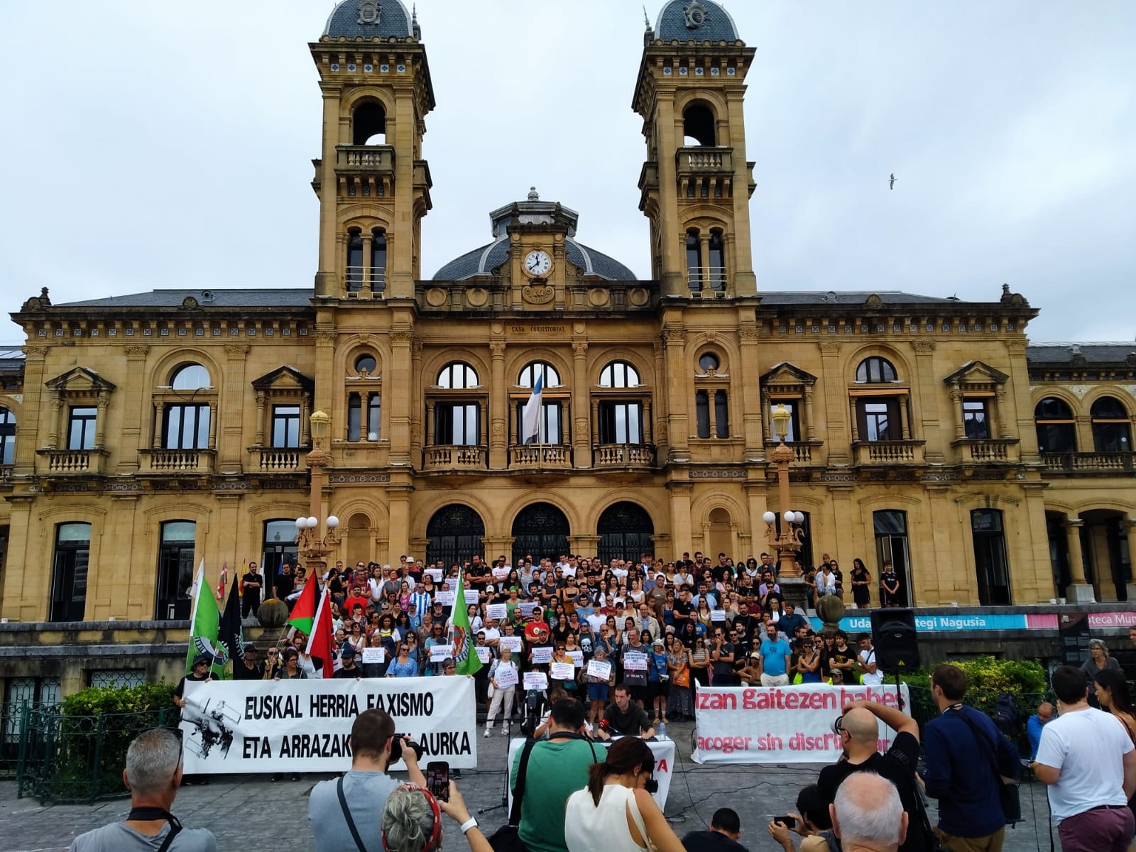 Hoy nos reunimos a las puertas del Ayuntamiento de Donostia varias ciudadanas donostiarras y miembros de diferentes agentes sociales y políticos porque estamos preocupadas por las actitudes racistas, clasistas y fascistas que se están dando en la ciudad.