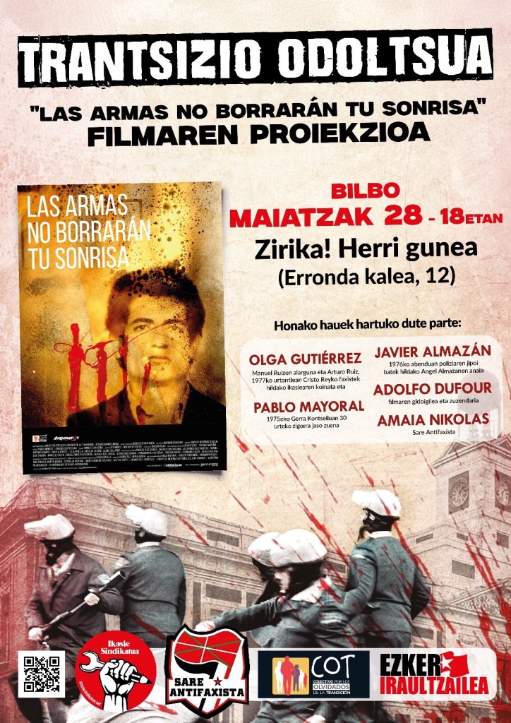 ‘Las armas no borrarán tu sonrisa’ (2024), documental dramatizado sobre los asesinatos de la semana negra de Madrid de 1977, dirigido por Adolfo Dufour recalará en Bilbao (28 de Mayo) y en Gasteiz (29 de mayo). El director y Javier Almazán, hermano del asesinado Angel a sus 18 años, entre otras personas estarán en la proyección.